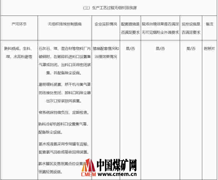 其中,企业基本情况应包括企业生产经营概况、主要生产装备及产能、清洁生产改造情况、原燃料替代情况、近一个周期年原燃料使用量和产品产量及运输情况、源头减排情况、有组织污染治理工艺和设施主要参数、重点废气治理工程设计和施工单位资质、环境管理基本情况等。环境管理基本情况应包括企业环保手续履行情况、近三年有无重大环境污染事故、近三年有无碳排放违法违规行为、近三年有无自行监测弄虚作假情况、是否列入失信企业名单、环保管理机构设置及专业技术人员配置、管理制度、管理体系以及排污许可证执行情况等。附件应包括厂区平面布置图、原燃料及产品运输路线图、在线监测数据达标分析、CEMS适用性检测报告、调试验收报告、监测比对报告、手工监测报告、无组织排放控制现场核查记录表、运输合同和进出厂凭证等,采用氧化原理等其他脱硝工艺的还应提供颗粒物与CPM评估报告、氮平衡测算分析报告,使用不明成分复合脱硫、脱硝剂的还应提供脱硫脱硝药剂的检测分析报告或MSDS。
