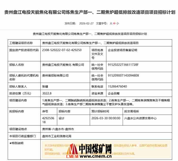 2月27日,贵州盘江电投天能焦化有限公司炼焦生产部一、二期焦炉超低排放改造项目项目招标计划发布。