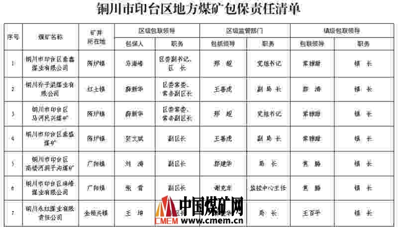 核心提示:近日,铜川市印台区对地方煤矿包保、包联责任人员进行了调整,现将调整后的信息予以公示,接受社会监督。铜川市印台区煤炭工业局